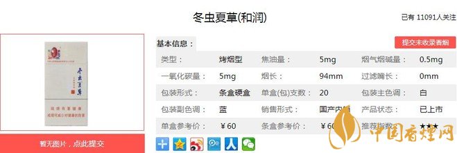 冬蟲(chóng)夏草(和潤(rùn))煙支長(zhǎng):97mm,烤煙型,包裝形式:條盒硬盒(每盒 20支,每條 10 盒)。煙嘴長(zhǎng):5mm。用云南優(yōu)質(zhì)煙葉為主料,配以福建、貴州等地的上等煙葉,經(jīng)過(guò)嚴(yán)格的原料挑選、精細(xì)加工,使煙絲色澤油潤(rùn)光鮮。下面我們一起來(lái)看冬蟲(chóng)夏草(和潤(rùn))的參數(shù)信息:焦油量:5mg 煙堿量:0.5mg 一氧化碳量5mg