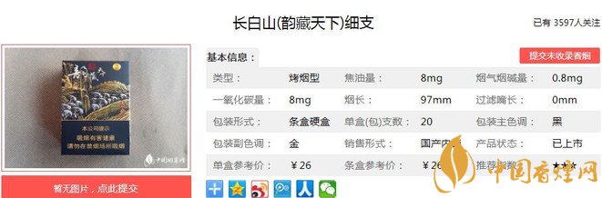 長白山韻藏天下細支煙支長97mm,專有的沉香活性成分制備技術及沉香載體柔性加工技術,保障了香氣釋放量的均勻一致,吸煙過程更輕松。下面我們一起來看長白山韻藏天下細支的參數信息:焦油量:8mg 煙堿量:0.8mg 一氧化碳量:8mg