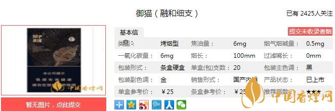 御貓融和細(xì)支煙支長100mm,過濾嘴長35mm,金色的御貓,以及具有藝術(shù)感的,變形的融和字樣,印制于過濾嘴紙張之上,煙絲色澤金黃。下面我們一起來看御貓融和細(xì)支的參數(shù)信息:焦油量:6mg 煙堿量:0.5mg 一氧化碳量:6mg