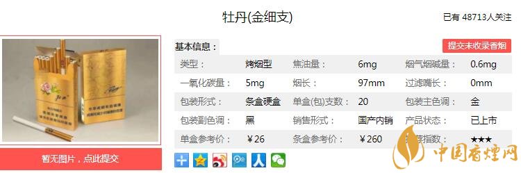 以上便是由香煙網(wǎng)小編為大家介紹的關(guān)于牡丹金細支多少錢一包 牡丹金細支口感及參數(shù)介紹的相關(guān)信息,想要了解更多有關(guān)內(nèi)容請點擊:日本黑駱駝香煙口感分析及包裝欣賞