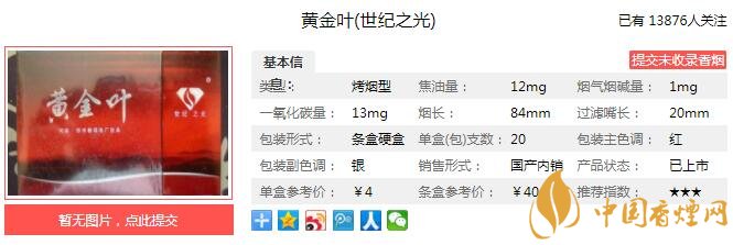 黃金葉(世紀(jì)之光)煙支長84mm,過濾嘴長25mm,選用深紅濾嘴、豎紋盤紙與燙金防偽水松紙,使整體煙支美觀修長、亭亭玉立。設(shè)計(jì)的每個(gè)環(huán)節(jié)與細(xì)節(jié)都精益求精,充分感受到“中檔煙的價(jià)位,高檔煙的享受”。下面我們一起來看黃金葉(世紀(jì)之光)的參數(shù)信息:焦油量:12mg 煙堿量:1.0mg 一氧化碳量:13mg