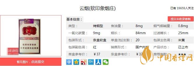 云煙(印象煙莊)系列與云煙重九系列、印象系列同出一脈,香原料均采自石林印象煙莊。煙支風(fēng)格和重九也很相似,但是卻有著自己的特色。金棕色流紋襯以金紅色云煙行書,黃色的拼音字母,相互襯托出一種檔次感。下面跟著香煙網(wǎng)小編一起來了解云煙(軟印象煙莊)的相關(guān)信息吧。