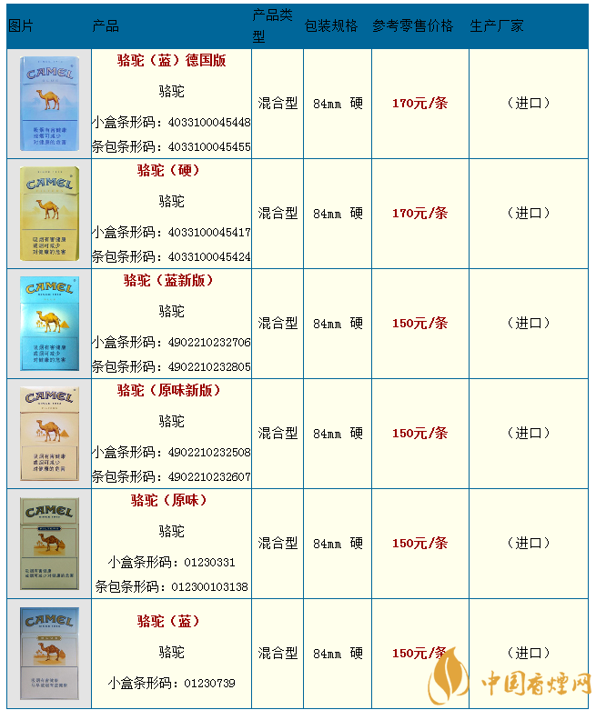 駱駝香煙品種包括了,駱駝(無嘴)、駱駝(軟黃)、駱駝(原味中免)、駱駝(藍中免)、駱駝(薄荷)、駱駝(特醇俄版)、駱駝(八角藍)、駱駝(硬藍99s)、駱駝(硬黃99s)等。