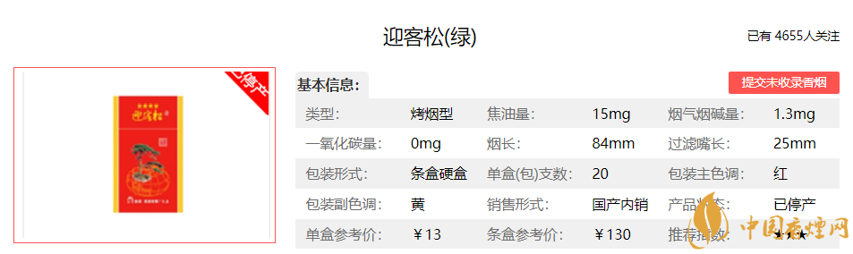 迎客松(綠)煙是安徽中煙工業(yè)有限責(zé)任公司旗下品牌迎客松香煙推出的一款焦油含量15mg的烤煙型香煙(俗名:Yingkesong Green)。
