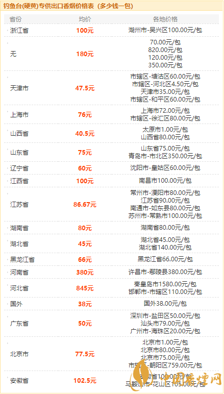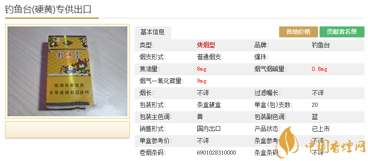 以上就是香煙網(wǎng)為您提供的釣魚臺硬黃香煙基本信息和2020釣魚臺(硬黃)專供出口香煙價(jià)格表,想要知道更多關(guān)于香煙的信息,請時(shí)刻關(guān)注香煙網(wǎng)。
