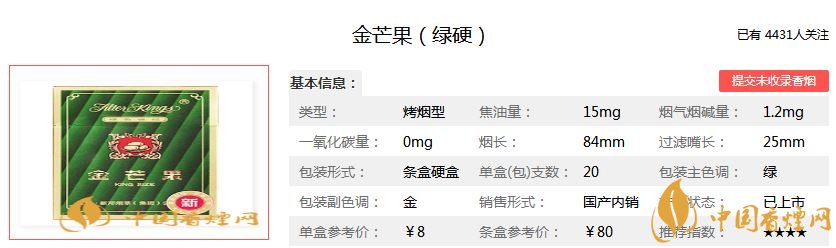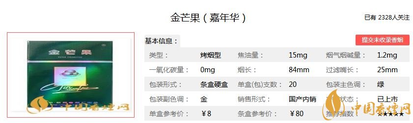 金芒果香煙是全國知名香煙品牌,雖然近幾年在市面上已經(jīng)很少見了,但是金芒果香煙的口感還是令許多煙民記憶深刻。你都知道哪幾款金芒果香煙?為了讓煙民們對(duì)金芒果香煙有更深刻的認(rèn)識(shí)。下面小編為大家介紹金芒果香煙的價(jià)格表和圖片。
