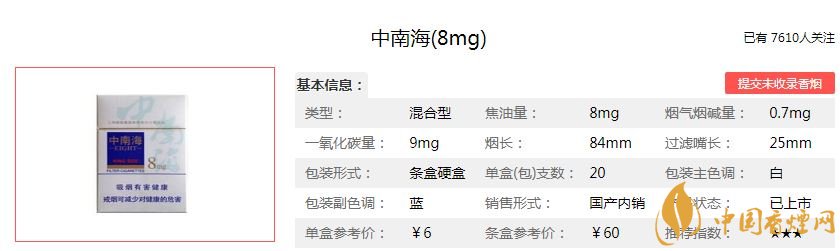 中南海香煙相信各位煙民們都不陌生,他是北京的香煙品牌,曾經(jīng)是毛主席的口糧。今天為大家介紹一款中南海8mg香煙。那么中南海8mg多少錢一包?為了讓大家對(duì)這款香煙更加了解,下面為大家介紹一下中南海8mg香煙價(jià)格表圖以及各地最新零售價(jià)格。