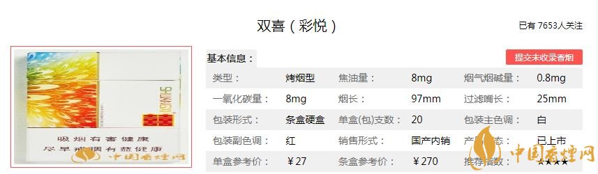 這款煙在廣東反而不多見,包裝簡約之中有炫目多彩的時(shí)尚氣息。雙喜彩悅沒有降低煙氣的凹槽,也無兩排細(xì)細(xì)的降焦線,絕對的素面朝天。香煙價(jià)位中等,但是質(zhì)量比較不錯(cuò),值得一品。經(jīng)調(diào)查雙喜彩悅售價(jià)為27元/包。