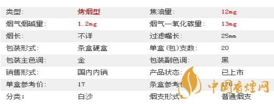 | 類型 :烤煙型 | 焦油量 :12mg | 煙氣煙堿量 :1.2mg | 一氧化碳量 :13mg |