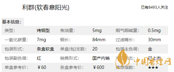 利群(軟春意陽光)采用國內(nèi)頂級的降焦技術(shù),配以一級香煙原料精心調(diào)制而成。它是國內(nèi)低烤香煙中的經(jīng)典高端之作。它的焦含量僅為5mg,香煙品質(zhì)卓越,煙香飄逸,口感醇香怡人,深受高端消費(fèi)群體的青睞。據(jù)小編調(diào)查得知市場售價(jià)為60元/包。
