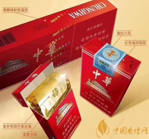 而轉(zhuǎn)包中華2018新年大吉香煙中華戊戌版,整條薄膜印刷有2018大吉字樣祝福語,小包口花處有新年大吉和金色LOGO,大紅色的福字鋁箔。香煙全部為“3”字頭。
