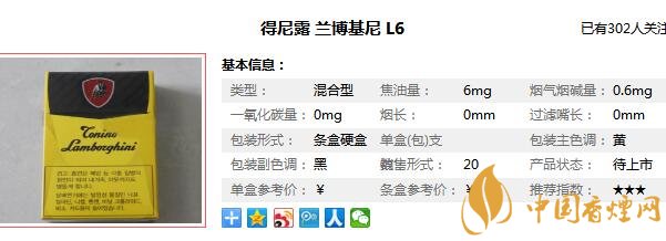 | 類型 :混合型 | 焦油量 :6mg | 煙氣煙堿量 :1mg | 一氧化碳量 :12mg |