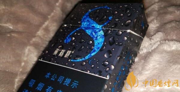 這款香煙正面外觀來看給人的第一印象它就是一款涼煙,炫酷純黑的底色搭配晶亮水滴為主色調(diào),同時冰藍顏色的抽象冰塊圖案形成了一個數(shù)字“8”形狀,讓人覺得涼爽的同時也突出了產(chǎn)品LOGO。