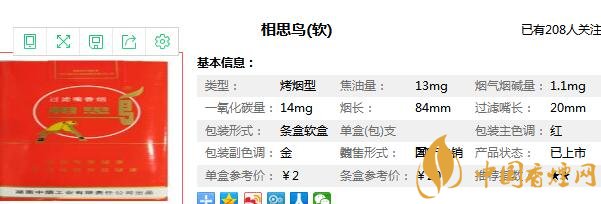 相思鳥品牌香煙創(chuàng)牌于20世紀(jì)80年代初,是郴州卷煙廠的主打品牌;“紅豆”創(chuàng)牌于20世紀(jì)80年代末,是零陵卷煙廠的主打品牌。創(chuàng)牌20多年來,共生產(chǎn)、銷售了200多萬箱,最高年產(chǎn)量達(dá)22.5萬箱,累計(jì)創(chuàng)造利稅約25億元,為國家財(cái)政收入做出了貢獻(xiàn),那么軟相思鳥多少錢一包,這款軟相思鳥香煙售價(jià)為2元/包。