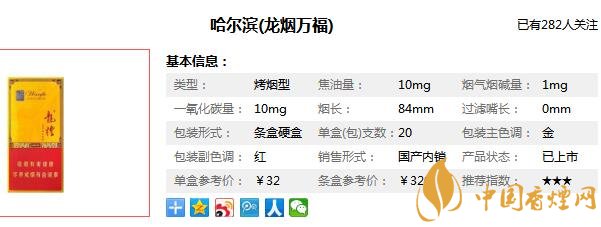 哈爾濱香煙作為黑龍江中煙的核心品牌,這個(gè)品牌自整合了龍煙之后,它的銷售趨勢(shì)也有了一定的增長(zhǎng),由于香煙自身的限制力度太高了,導(dǎo)致了這個(gè)品牌產(chǎn)業(yè)也一直不溫不火,那么在對(duì)哈爾濱龍煙萬(wàn)福價(jià)格圖片進(jìn)行介紹之前,來(lái)看看龍煙福萬(wàn)多少錢(qián)一包,這款香煙的售價(jià)為32元/包。