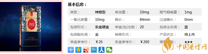 | 類型 :烤煙型 | 焦油量 :10mg | 煙氣煙堿量 :1mg | 一氧化碳量 :10mg |