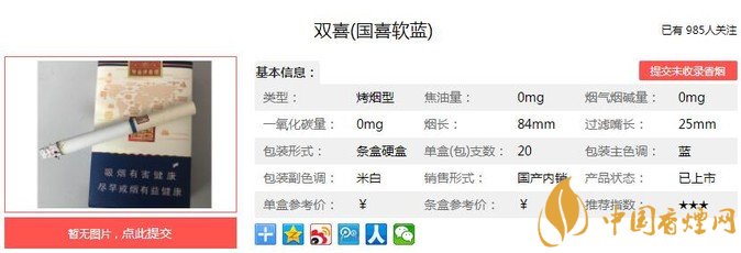 雙喜國喜軟藍(lán)煙支長84mm,過濾嘴長:25mm,因為這款是“非賣品”,所以全部為“0”的理化指標(biāo),當(dāng)然這不可能是“0”焦油的,是廠家沒有標(biāo)注具體的理化指標(biāo)而已。