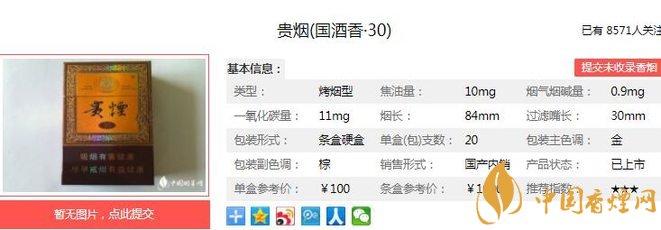 貴煙國酒香30煙支長84mm,過濾嘴長30mm,“玉液珠”濾嘴:純天然材料包裹國酒香特征原料,給消費者強烈的國酒香風格感受。下面我們一起來看貴煙國酒香30的參數(shù)信息:焦油量:10mg 煙堿量:0.9mg 一氧化碳量:11mg