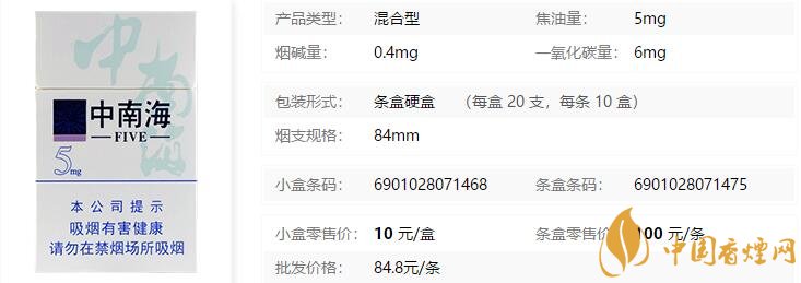 中南海(5mg)煙支長:84mm,混合型,包裝形式:條盒硬盒(每盒 20 支,每條 10 盒)。5mg低自由基中南海香煙采用北京卷煙廠獨創(chuàng)的新型生物濾嘴技術(shù)、低自由基技術(shù),在降低產(chǎn)品焦油含量的同時,使煙氣中導(dǎo)致疾病與衰老的烷基、烷氧自由基含量有效降低。下面我們一起來看中南海(5mg)的參數(shù)信息:焦油量:5mg 煙堿量:0.4mg 一氧化碳量:6mg