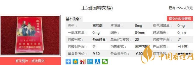 王冠國粹榮耀是一款機(jī)制型的雪茄煙,它的煙支長短和普通香煙一樣,焦油含量為適中。以國內(nèi)最優(yōu)質(zhì)的煙葉原料,配以進(jìn)口的煙葉,經(jīng)自然的醇化發(fā)酵,精心調(diào)味之后,機(jī)卷而成。但是做口糧大部分人肯定不習(xí)慣,偶爾嘗嘗還是不錯的選擇。經(jīng)香煙網(wǎng)小編市場調(diào)查王冠國粹榮耀售價為30元/包。