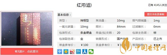 紅河道煙支長(zhǎng)84mm,過(guò)濾嘴長(zhǎng)35mm,煙支造型是不太常見(jiàn)的小方格,煙絲填充飽滿。煙嘴、煙支的包裝工藝都是首屈一指,高端產(chǎn)品的形象一覽無(wú)遺。下面我們一起來(lái)看紅河道的參數(shù)信息:焦油量:10mg 煙堿量:1.0mg 一氧化碳量:10mg