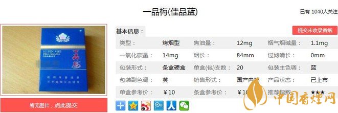 一品梅佳品藍(lán)香煙曾經(jīng)是很多人心中的經(jīng)典,香氣豐富飄逸,煙氣柔和,吸味醇和,余味純凈舒適,回味甜感。很多人稱它藍(lán)一品,在煙民心中的地位很不錯,但目前已經(jīng)很難找到了。經(jīng)香煙網(wǎng)小編市場調(diào)查一品梅佳品藍(lán)售價為10元/包。
