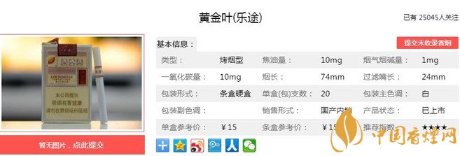 研發(fā)樂途時在原料上精中選精、在配方上優(yōu)中選優(yōu)、在工藝上量身定制,傾注了大量心血。煙支變短,工藝不短;煙支變短,韻味更長。煙氣飽滿,煙草本香濃郁,很受消費者的喜歡。經(jīng)香煙網(wǎng)小編市場調(diào)查黃金葉樂途售價為15元/包。