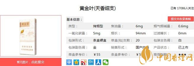 黃金葉天香細(xì)支類別為“高一類A(細(xì)支)潛力規(guī)格”,烤煙類型。外包裝沿襲天葉低調(diào)奢華的品系風(fēng)格,一如既往的黃金標(biāo)準(zhǔn),一絲不茍的手捻精神,和大小天葉系列一脈相承,據(jù)香煙網(wǎng)小編市場調(diào)查它的零售參考價(jià)為55元/包。