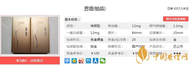 經(jīng)過科研人員詳細(xì)的市場調(diào)研和精心研發(fā),使鉑晶“蘇煙”集多項(xiàng)創(chuàng)新成果及專利于一體:選取國內(nèi)外符合產(chǎn)品要求的上等優(yōu)質(zhì)煙葉原料精心調(diào)配,采用獨(dú)特的制絲加工工藝,突出鉑晶“蘇煙”的色香味俱佳。經(jīng)香煙網(wǎng)小編市場調(diào)查蘇煙鉑晶售價(jià)為100元/包。