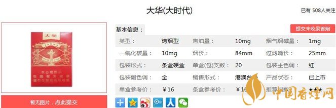 臺(tái)灣制造,取材自然,配方考究,工藝精湛,原料甄選自南緯23° 以北和北緯23°以南世界級(jí)優(yōu)質(zhì)名產(chǎn)區(qū)出產(chǎn)的優(yōu)質(zhì)烤煙煙葉,煙氣醇和飽滿(mǎn),煙香細(xì)膩豐富,口感純正,三香合一。經(jīng)香煙網(wǎng)小編市場(chǎng)調(diào)查大華大時(shí)代售價(jià)為16元/包。