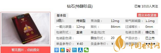鉆石特醇珍品煙支長84mm,選用了高透氣度高強度的奧地利盤紙和過濾效率高的醋酸咀棒,運用新技術(shù),加長了濾咀,使卷煙的焦油等成份得到更加有效的截留,加工工藝先進,裝璜設(shè)計清新爽目,顯示產(chǎn)品的高檔。下面我們一起來看鉆石特醇珍品的參數(shù)信息:焦油量:12mg 煙堿量:1.1mg 一氧化碳量:12mg