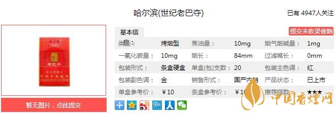 哈爾濱老巴奪煙支長84mm,過濾嘴長25mm,使用從植物中提取的天然香原料和天然植物保潤技術(shù),保證卷煙舒適感;以清甜香風(fēng)格為基礎(chǔ),采用創(chuàng)新性中支(7.0mm)規(guī)格,在保證滿足感前提下,注重?zé)熛愕拇己透?、舒適感和甜潤感,同時兼顧卷煙安全性。下面我們一起來看哈爾濱老巴奪的參數(shù)信息:焦油量:10mg 煙堿量:1.0mg 一氧化碳量:10mg