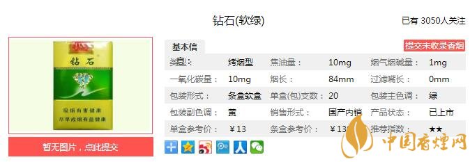 鉆石(軟綠)在繼承綠石2代風格特點的基礎上,重點在煙香的醇和飽滿、口感的甜潤舒適上進行提升,進一步突出了“醇甜香”的品類特征,葉組配方精選云南、巴西、津巴布韋優(yōu)質烤煙,添加新型功能香料,采用特殊工藝處理,強化風格特色。經(jīng)香煙網(wǎng)小編市場調查鉆石軟綠售價為13元/包。