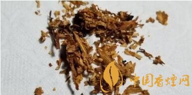攤開煙絲,油潤紅亮,棕黃色自然陳化的烤煙原片絲占據(jù)80%的比例,間雜有切寬稍細的深棕色煙絲,煙梗則切得極薄,一般長度在6-7mm左右。用料比較厚道實在。