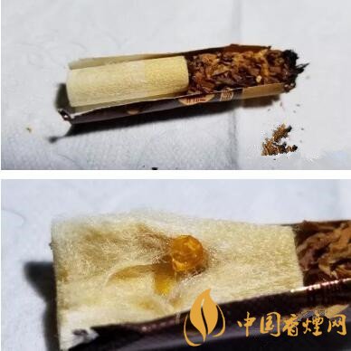 剖開濾嘴,是經(jīng)典的一段式醋酸纖維絲束。降焦孔開在了前1/3段,從絲束的顏色變化來看,前段微黃,后段稍淺,顏色變化均勻。也沒有從降焦孔向后的條帶,應是煙氣流速稍慢,空氣混合充分的結果。剖開絲束,可見橙色的爆珠。