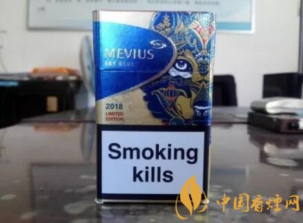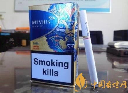 我們首先來(lái)看一看煙盒的整體包裝設(shè)計(jì)情況。柔七的LOGO自不必多言,它的下方印有“SKY BLUE”字樣,意指“天藍(lán)”或者“藍(lán)天”款式。歐盟樣式的黑色粗警示框的上方,同時(shí)印有“2018 LIMITED EDITON”字樣,意為“2018限量款”。