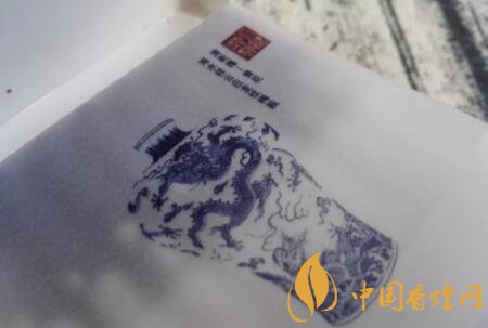 先來欣賞一下煙盒內(nèi)里的包裝設計特點。向上掀開合蓋,會發(fā)現(xiàn)上蓋內(nèi)里印有數(shù)條騰龍圖案,以及china瓷字樣。
