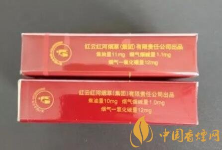 翻轉(zhuǎn)至煙盒的左側(cè),都是生產(chǎn)廠商的名稱和這款香煙的理化含量標(biāo)識(shí)。廠家同為“紅云紅河煙草(集團(tuán))有限責(zé)任公司”。