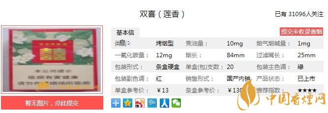 雙喜蓮香煙煙支長84mm,過濾嘴長34mm,煙支呈767排列,煙支設(shè)計(jì)簡單清新,淺黃色的煙嘴配上雙喜logo,一朵蓮花襯托在雙喜的logo旁。煙絲色澤深黃,無煙梗,煙葉發(fā)酵程度、膨脹程度合適。下面我們一起來看雙喜蓮香的參數(shù)信息:焦油量:10mg 煙堿量:1.0mg 一氧化碳量:12mg
