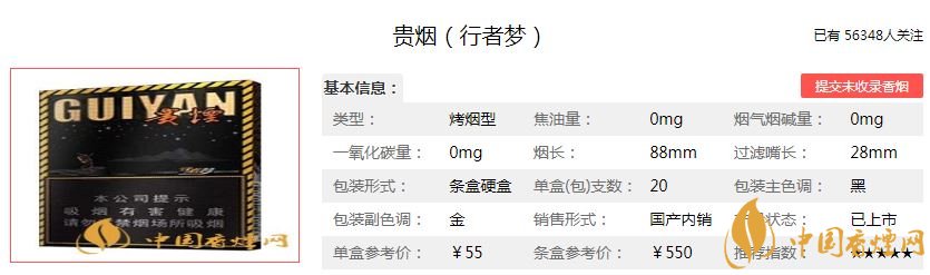 貴煙(行者夢)香煙55元/包,也是2019年新推出的產(chǎn)品,焦油量:9mg,煙堿量:0.9mg,一氧化碳量:8mg,外包裝經(jīng)典大氣。