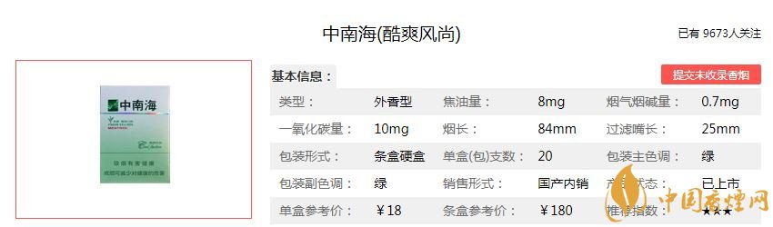 中南海香煙是國內(nèi)首個(gè)低焦含量的香煙品牌,旗下的香煙品種很多,不僅用于內(nèi)銷,很多香煙還對(duì)外出口,是國內(nèi)目前最為暢銷的香煙品牌之一。中南??崴L(fēng)尚屬于典型的外香型香煙,外觀清新淡雅,突出與口感結(jié)合的清涼之意。