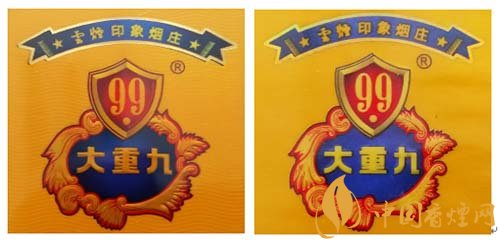 真品卷煙:1.“盾牌”圖案呈現(xiàn)凸起,手摸凹凸明顯,數(shù)字“9”筆畫中間凸邊緣凹。2.花團(tuán)圖案整體高于商標(biāo)紙面,細(xì)節(jié)處凹凸感強(qiáng)。3.“大重九”字體筆畫呈現(xiàn)中間凸邊緣凹,立體感強(qiáng)。4.藍(lán)色底紋顏色重,邊緣向中間色彩過渡自然。