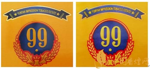 真品卷煙:1.商標(biāo)LOGO稻穗圖案凸起,整體立體、飽滿,大豐收。2.99數(shù)字筆畫圓潤(rùn)、飽滿,下面圓點(diǎn)尤為突出。3. 藍(lán)色底紋顏色重,邊緣向中間色彩過渡自然。4.商標(biāo)紙流水紋路清晰可見。