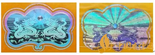 假冒卷煙:該款假冒卷煙雙龍戲珠激光全息防偽,龍圖案模糊,珠子呈現(xiàn)圓形,底紋無點(diǎn)狀痕跡,整體圖案粗糙。如圖左真右假