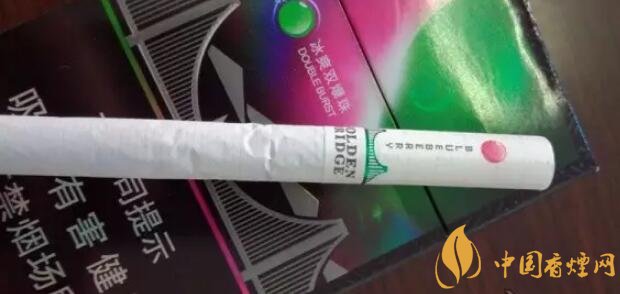 國產(chǎn)爆珠香煙金橋煙支上一道綠箍,一座綠色的金門大橋坐落其上,暗示了這包煙即使不爆珠也自帶的涼味。水松紙上有爆珠示意圖,靠唇端是紫紅色的藍(lán)莓,靠煙絲端是翠綠色的薄荷。又要用圓點(diǎn)顯示爆珠位置,又要用英文字母標(biāo)注爆珠口味,如果同處一側(cè)將顯得擁擠,因此二者分居濾嘴兩側(cè)錯(cuò)開。煙支上沒有漢字,GOLDEN BRIDGE、BLUEBERRY和COOL MINT,營造出了外煙的既視感。