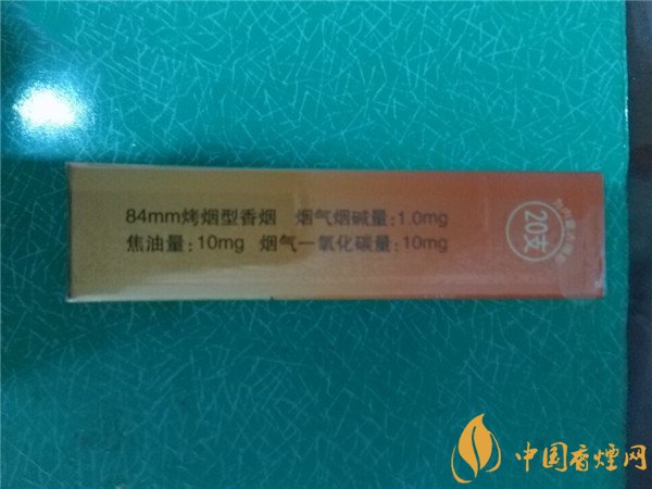 煙盒右側(cè)標注著香煙的理化數(shù)值,標注著過濾嘴香煙長84mm,1mg煙氣煙堿量,10mg焦油量,10mg煙氣一氧化碳量,印有主品牌單位名稱,數(shù)量指標。