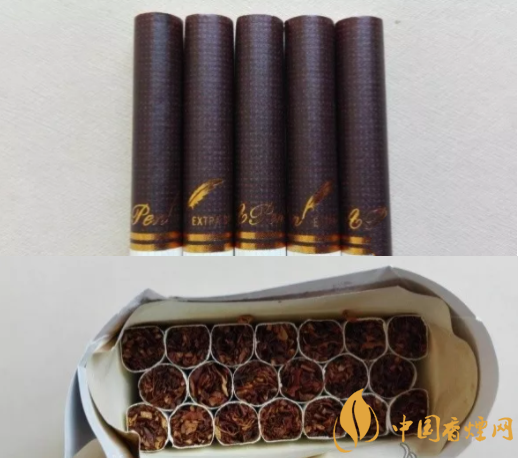 從底部開包,煙支呈7-6-7形式排列,泰山壹枝筆香煙煙嘴水松紙呈咖啡色,色彩沉穩(wěn)厚實,其上印有紅色的點狀紋飾,比較雅致,金色的壹枝筆logo和英文名稱環(huán)繞一周,比較奢華。