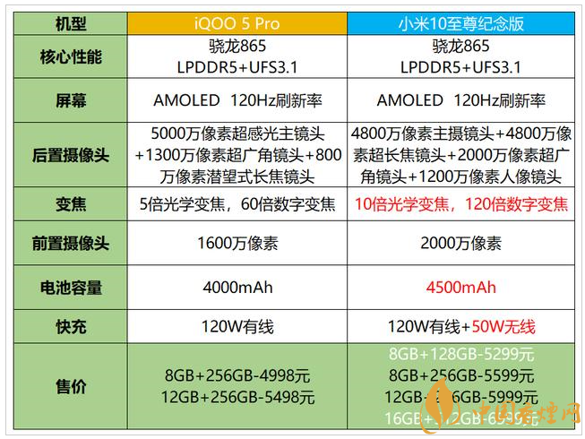小米10至尊紀(jì)念版的8GB+256GB售價5599元,12GB+256GB售價5999元,iQOO5 Pro分別為4998元和5498元,兩個版本的差價分別是500元、600元。