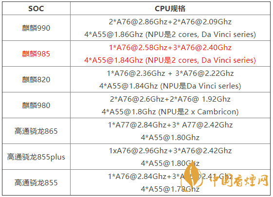 從規(guī)格來(lái)看,麒麟985定位于麒麟820、麒麟9905g之間, 采用1個(gè)a76 (2.58ghz) +3個(gè)a76(2.4ghz)+4個(gè)a55 (1.84ghz) , 搭載雙核達(dá)芬奇npu。同時(shí)集成八核心mali-g77gpu,以及麒麟990同款的雙核心npuai單元、isp5.0圖像 單元。
