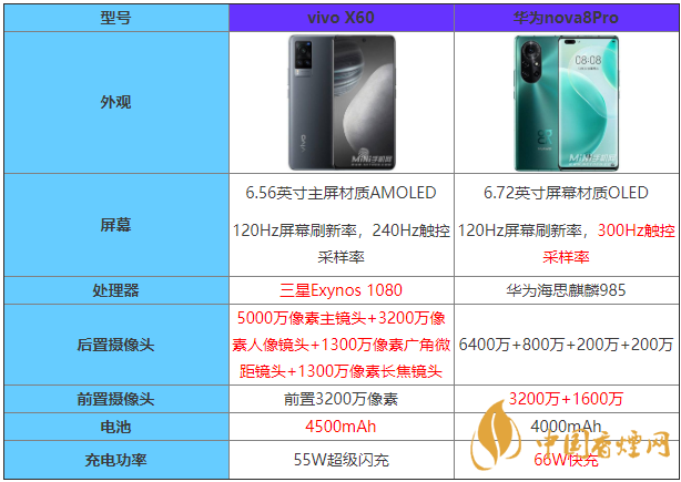 近期迎來(lái)vivoX60的發(fā)布,吸引大家目光的同時(shí),華為nova8Pro也格外引人注目,vivoX60和華為nova8Pro那個(gè)好,下面香煙網(wǎng)小編將對(duì)vivoX60和華為nova8Pro參數(shù)對(duì)比進(jìn)行介紹,感興趣的朋友一起來(lái)看看吧!